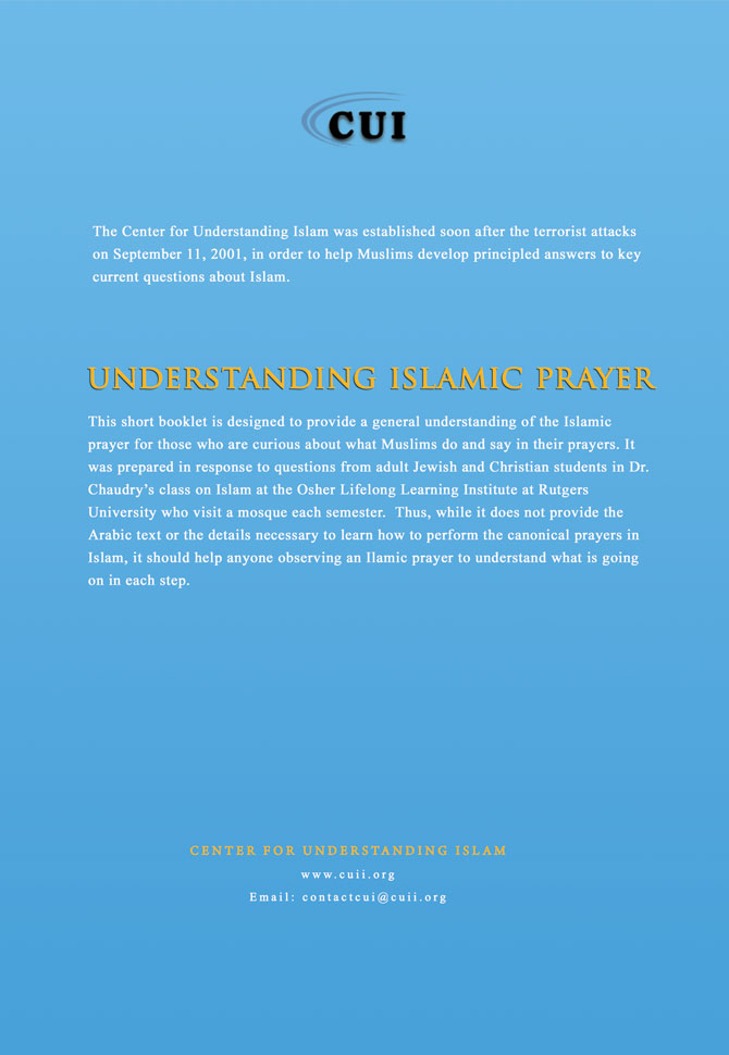 This short booklet is designed to provide a general understanding of the Islamic prayer for those who are curious about what Muslims do and say in their prayers.Itwas prepared in response to questions from adult Jewish and Christian students in Dr. Chaudry’s class on Islam at the Osher Lifelong Learning Institute at RutgersUniversity who visit a mosque each semester. Thus,while it does not provide the Arabic text or the details necessary to learn how to perform the canonical prayers in Islam, itshould help anyone observing an Islamic prayer tounderstand what is going on in each step.